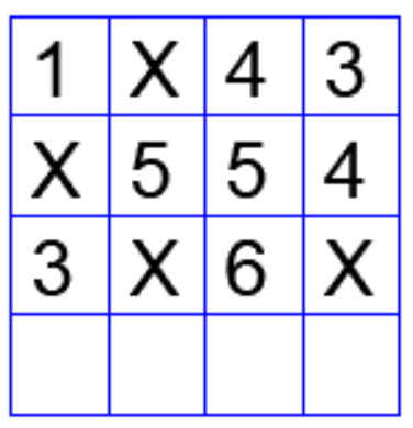 In the 4 × 4 array shown below, each cell of the first three rows has either a cross (X) or a number.