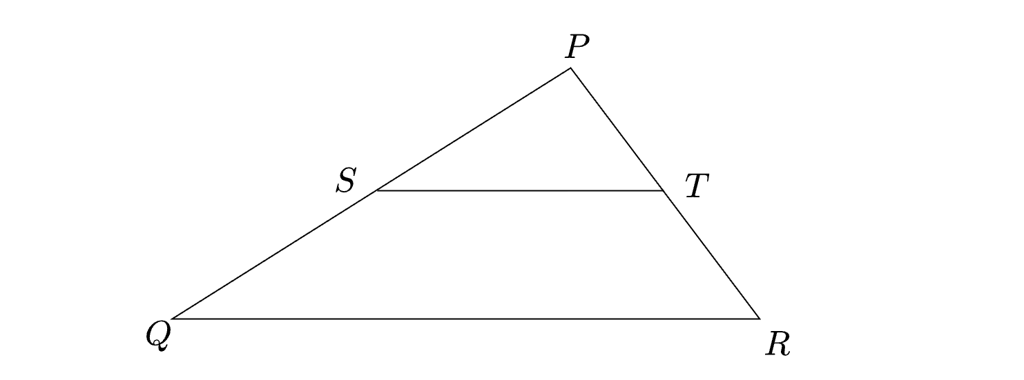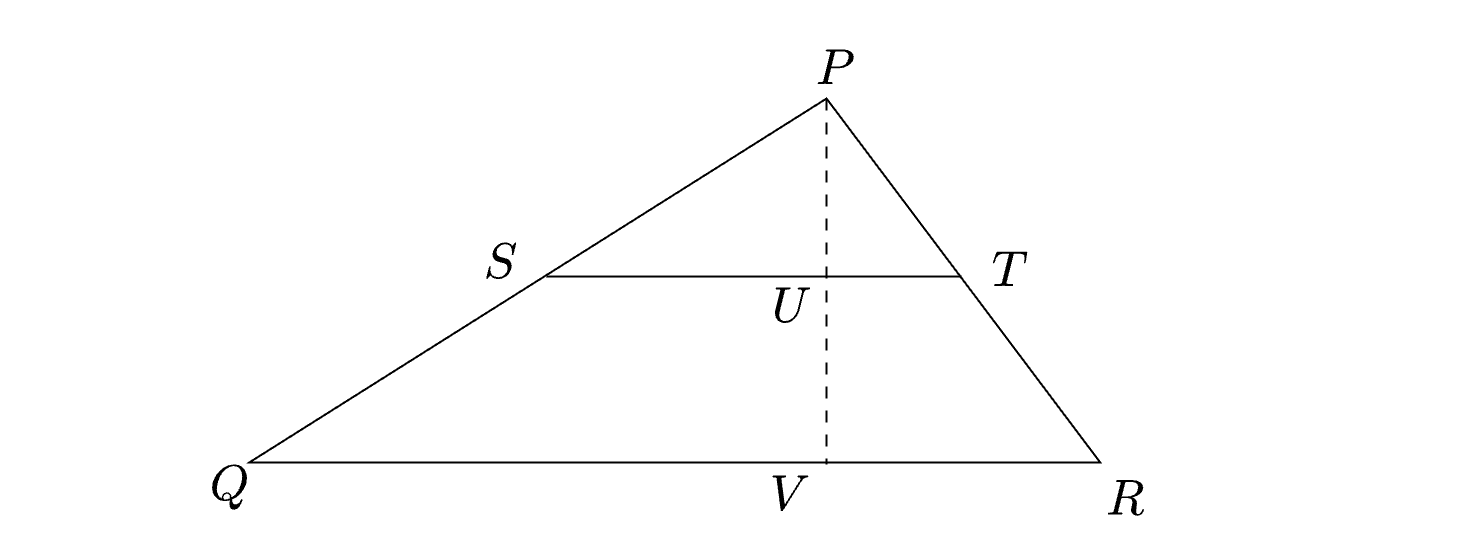 We are given that \(UV = \cfrac{PV}{2}\). This leaves us with \(PU = UV\). Since \(\Delta PST\) and \(\Delta PQR\) are similar, and since \(PU = \cfrac{PV}{2}\), the area of \(\Delta PST\) is one-fourth that of \(\Delta PQR\). The area of the trapezium \(SQRT\) is three-fourth that of \(\Delta PQR\). The required ratio is \(\cfrac{\frac{1}{4}}{\frac{3}{4}} = \cfrac{1}{3}\).