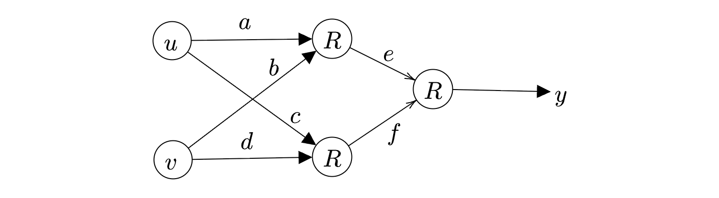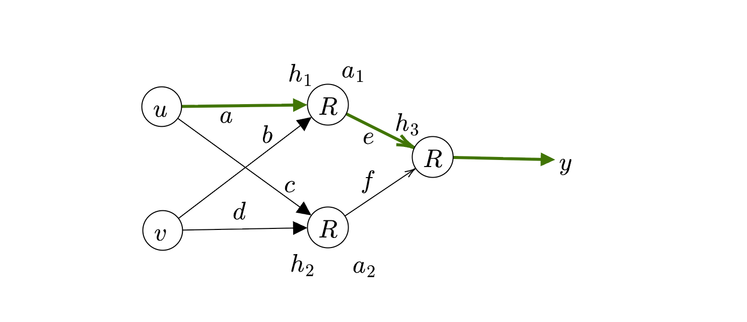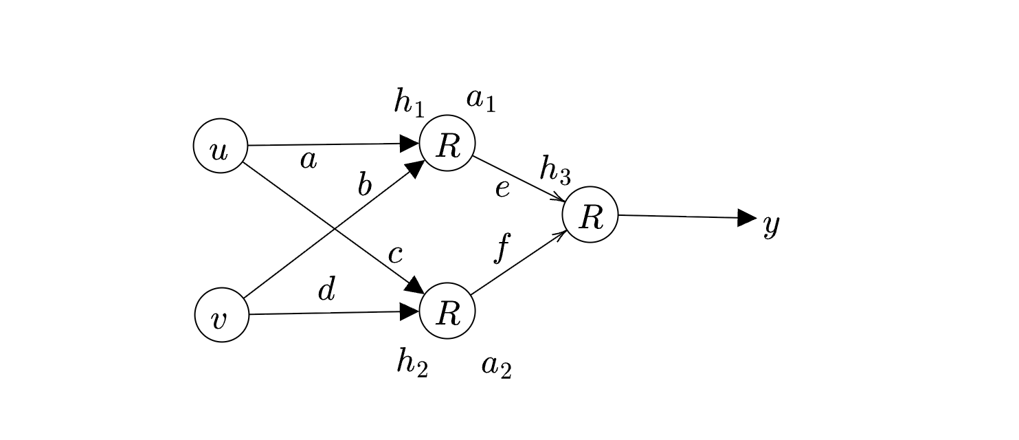 \[ \begin{array}{ r l l } h_{1} & =au+bv & =5\\ a_{1} & =\max( 0,h_{1}) & =5\\ h_{2} & =cu+dv & =-1\\ a_{2} & =\max( 0,h_{2}) & =0\\ h_{3} & =ea_{1} +fa_{2} & =20\\ y & =\max( 0,h_{3}) & =20 \end{array} \]