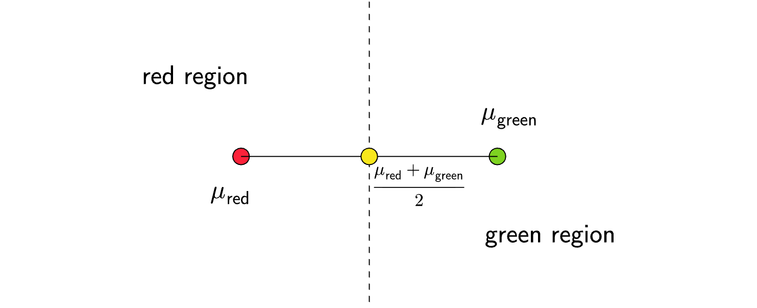 Note: Geometrically, the perpendicular bisector of the line segment joining the two means is the decision boundary of the classifier.
